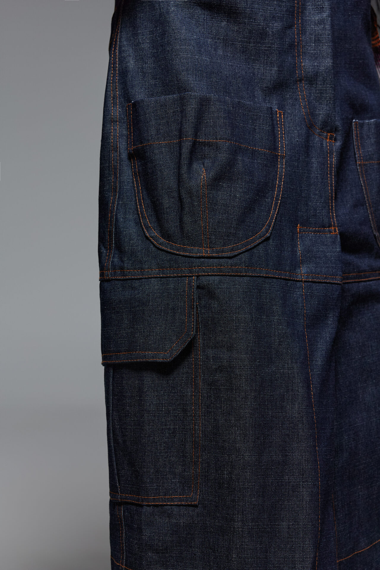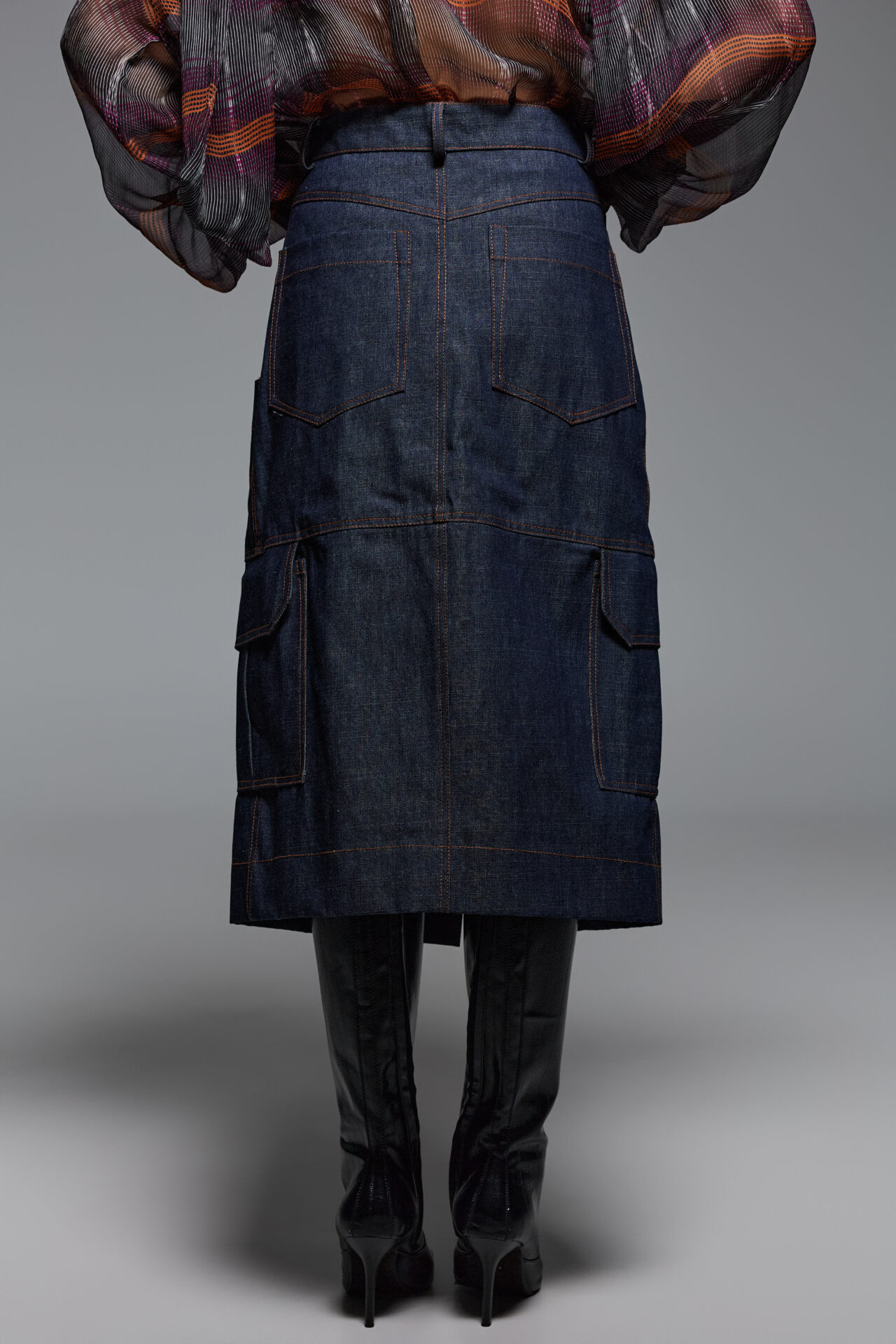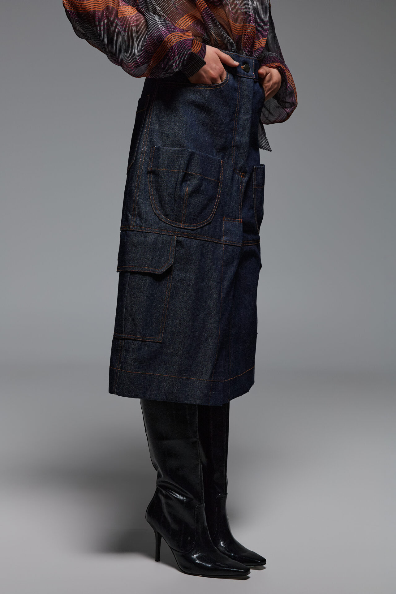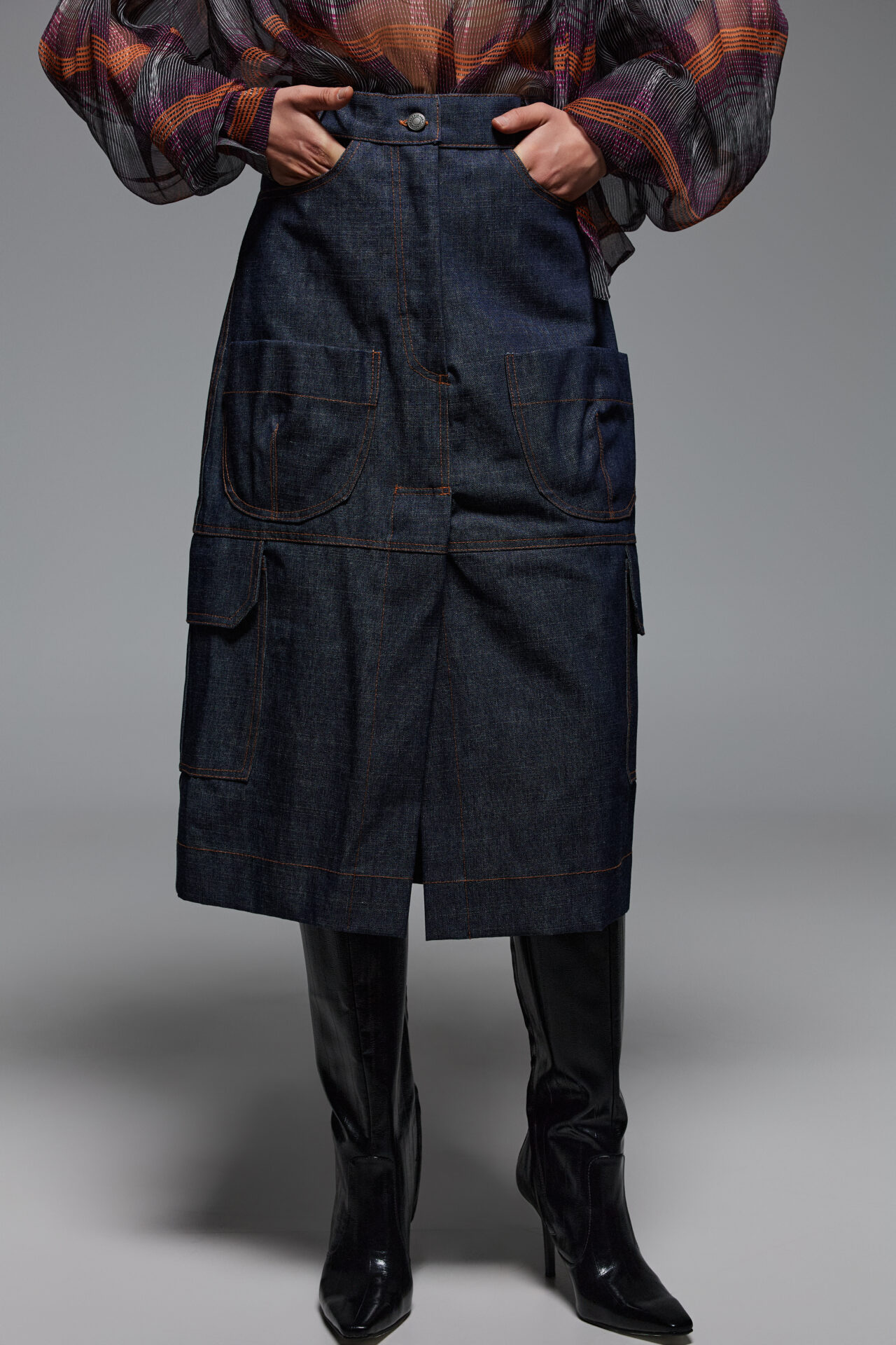 This denim skirt is designed in high-rise wais and midi length. . Designed for a structured and loose fit silhouette with front and back patch pockets. Has decorative external seems and  utilitarian-inspired panels that creates a front slit. Wear yours with the coordinating shirt.