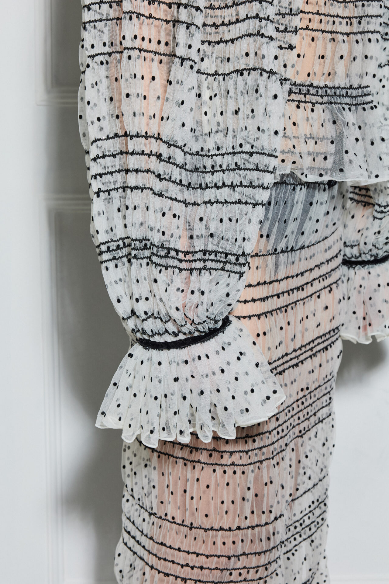 This top has a new romantic inspired style, cut from polka dot sequned tulle fabric. There is a front- black velvet bow with a rauched neck and cuffs
